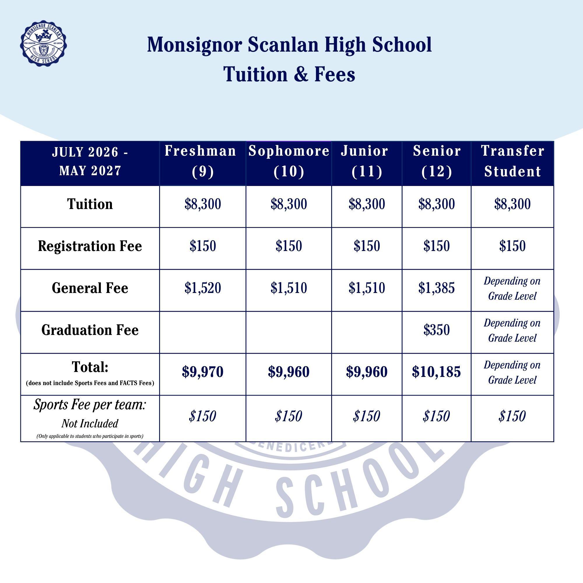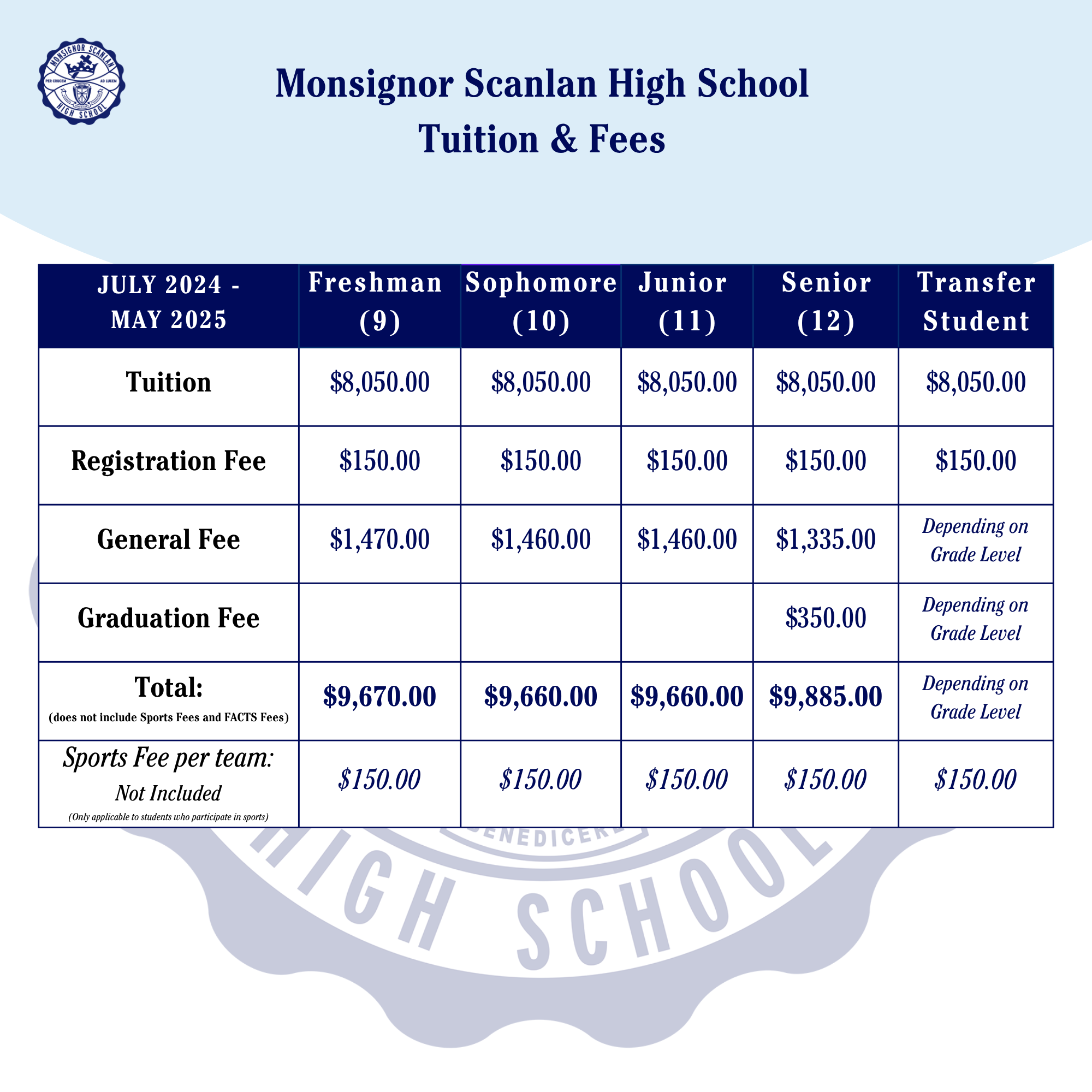 Monsignor Scanlan High School - a welcoming Catholic co-educational secondary school is committed to instilling traditional Christian values and fostering high academic standards. To sustain our quality education, we rely on tuition and fees. We kindly ask parents and guardians to honor their agreements and adhere to the tuition payment plan.